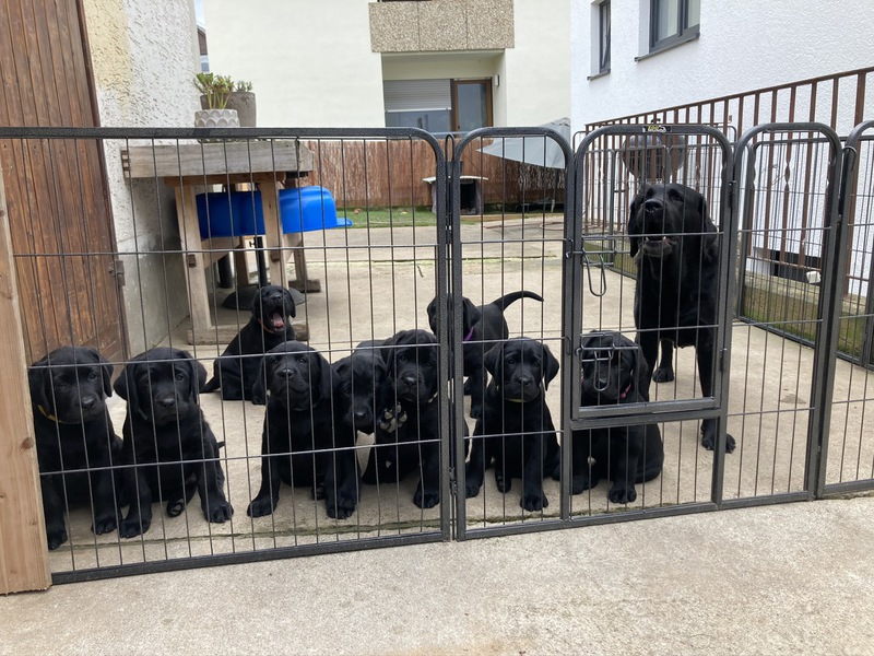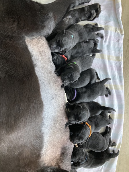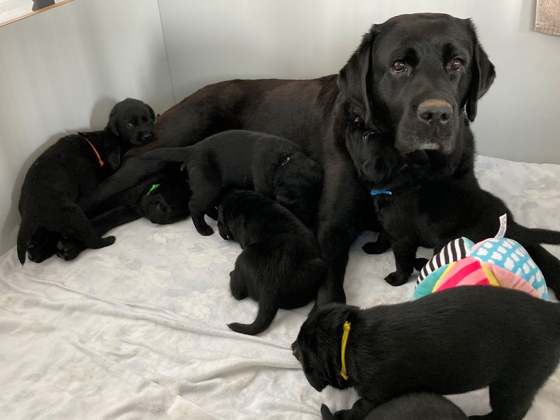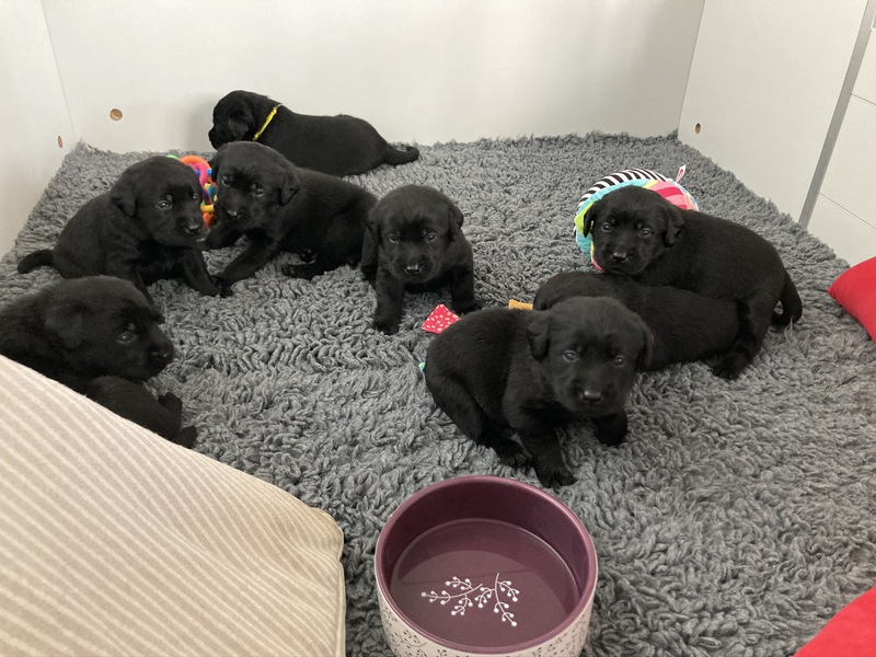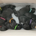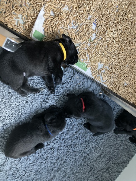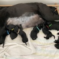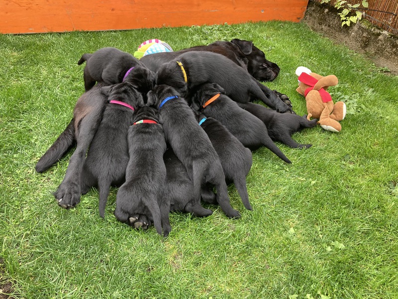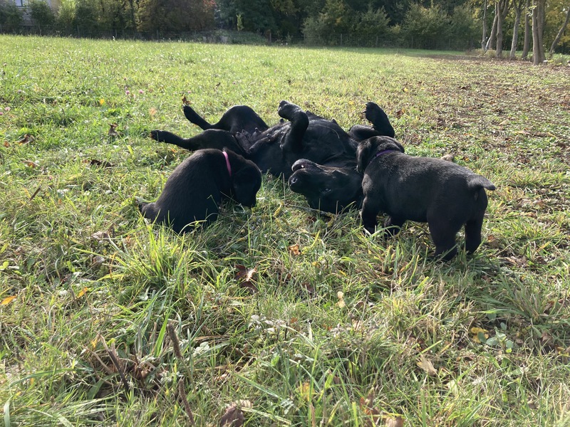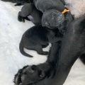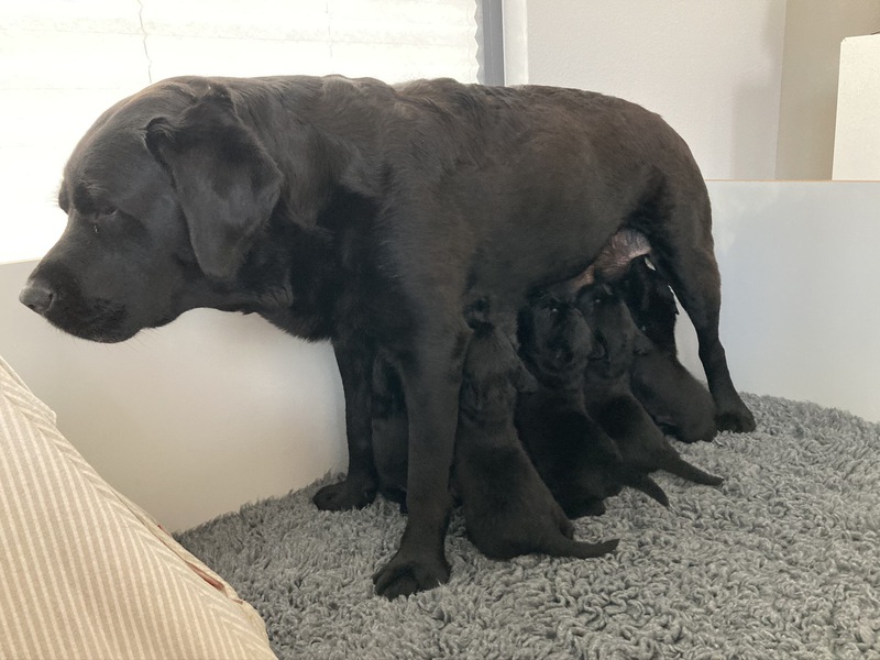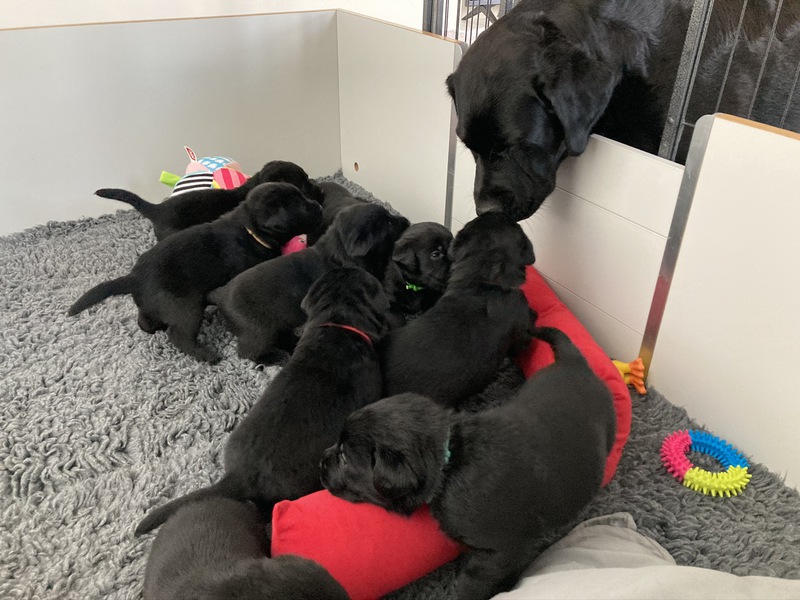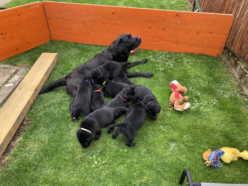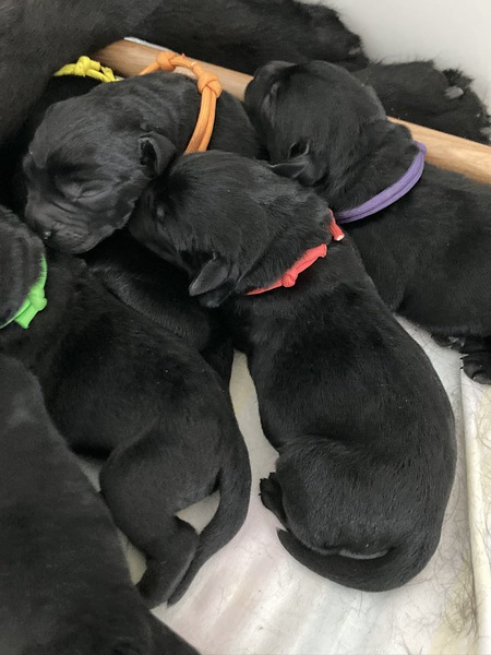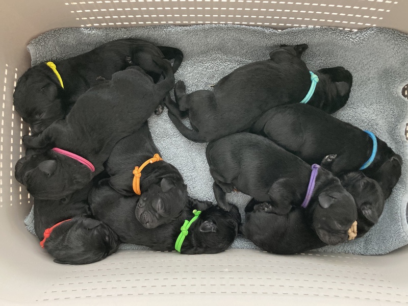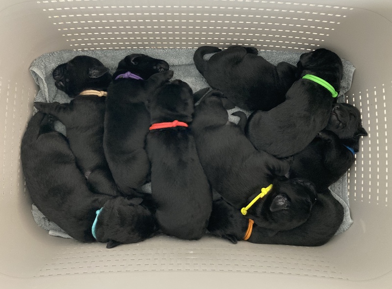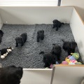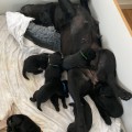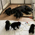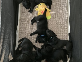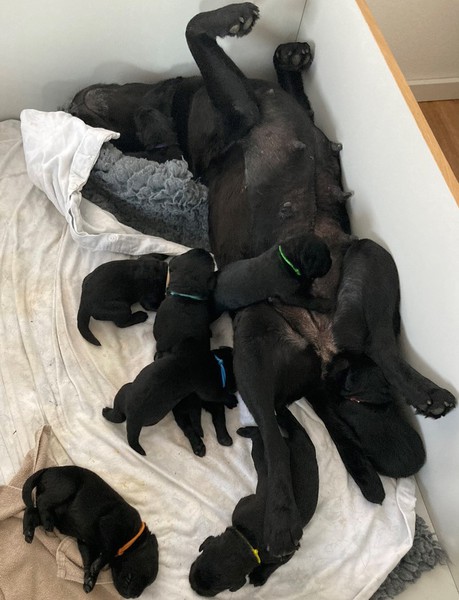 Am vergangenen Montag den 31.08.2020 (Tag 61 der Trächtigkeit) brachte Emma 6 schwarze Hündinnen und 4 schwarze Rüden auf die Welt. Der erste Welpe ließ lange auf sich warten. Trotz anhaltenden Presswehen über mehrere Stunden hatte Emma große Mühe den Welpen auf die Welt zu bringen. Erstaunlicherweise lebte dieser und war topfit. Auch mit dem zweiten Welpen - ein Rüde - hatte Emma zu kämpfen, er steckte lange im Geburtskanal fest. Leider hat er es nicht geschafft. Er brachte stolze 560 g auf die Waage... So entschieden wir uns nach dem 3. Welpen - Emma zuliebe und um die restlichen Welpen nicht zu gefährden - schweren Herzens zu einem Kaiserschnitt. Insbesondere da sich noch weitere 7 Welpen den Weg ins Leben erkämpfen mussten. Eine gute Entscheidung wie sich heraus stellte, denn auch die restlichen Welpen brachten recht hohe Gewichte auf die Waage. Am Ende verbleiben 9 quiekende und fidele Welpen in der Wurfkiste :-)