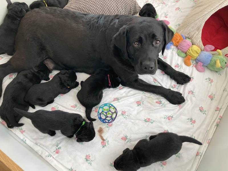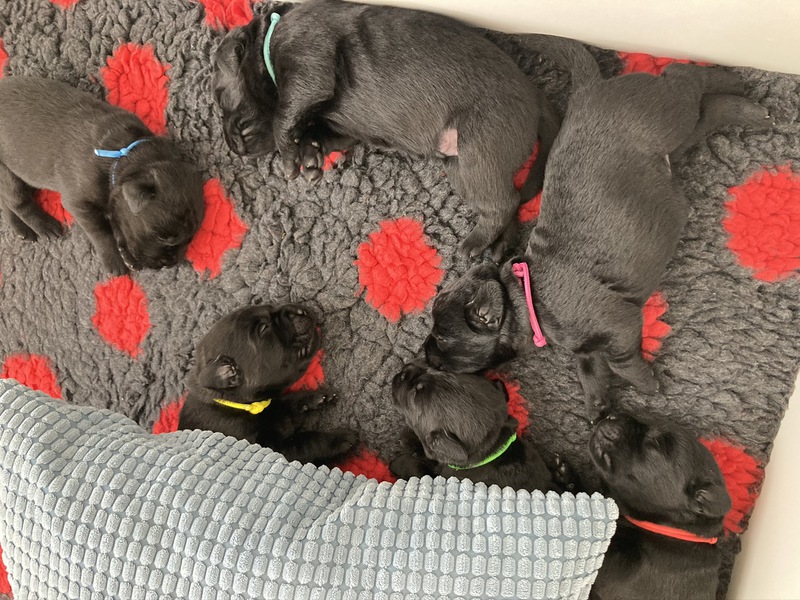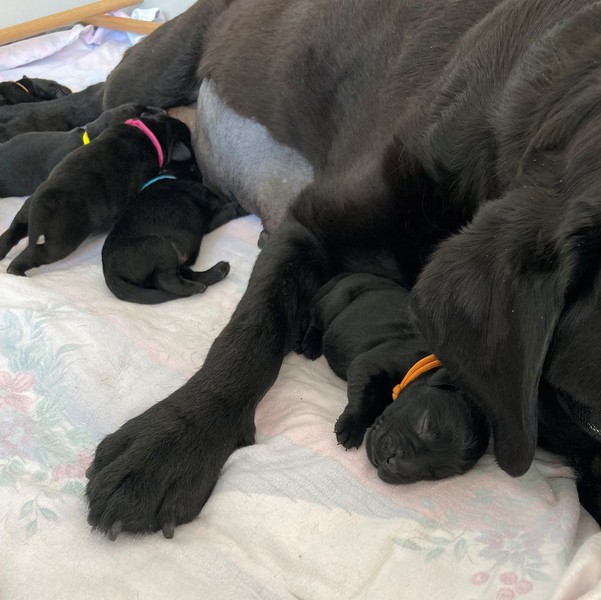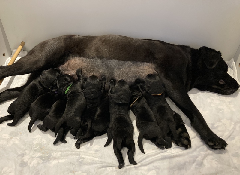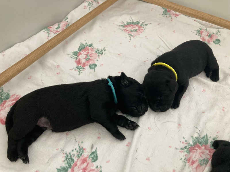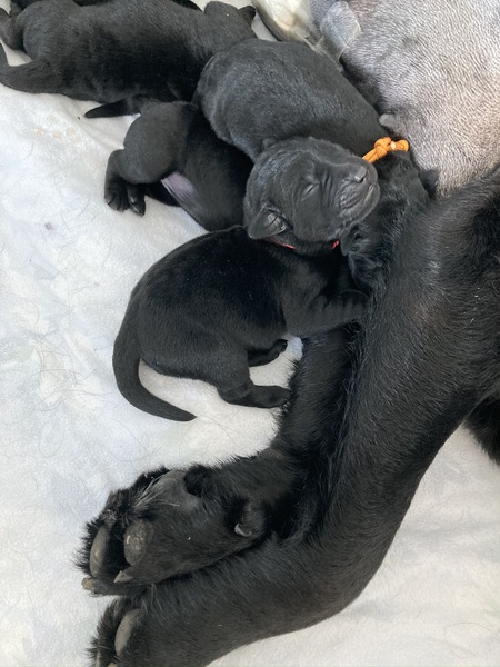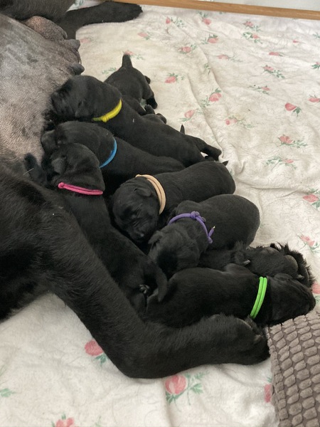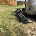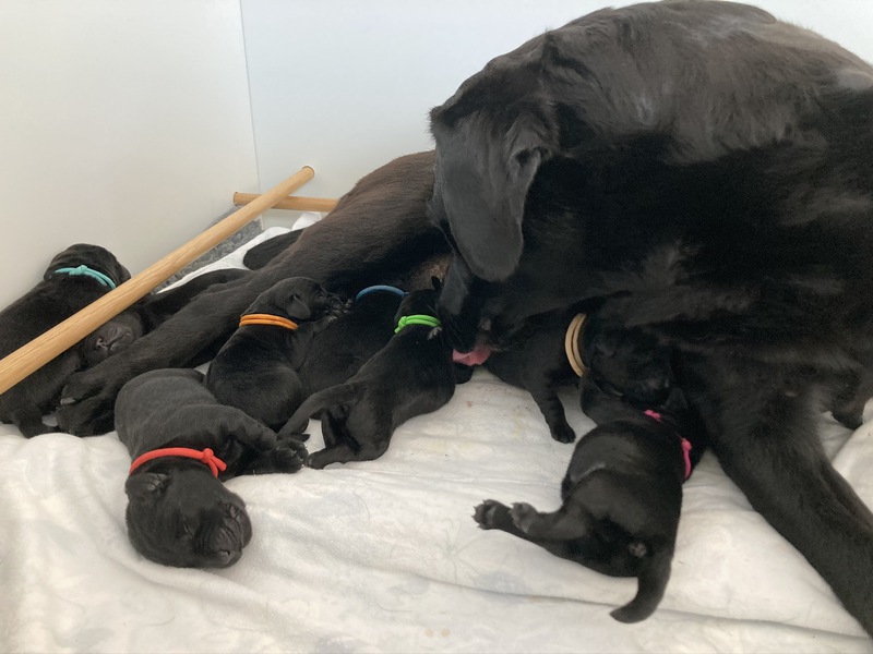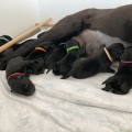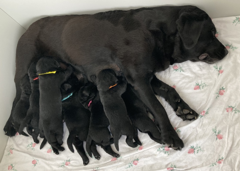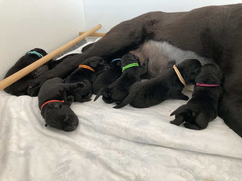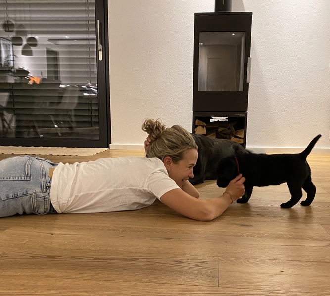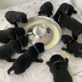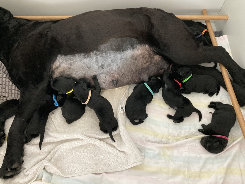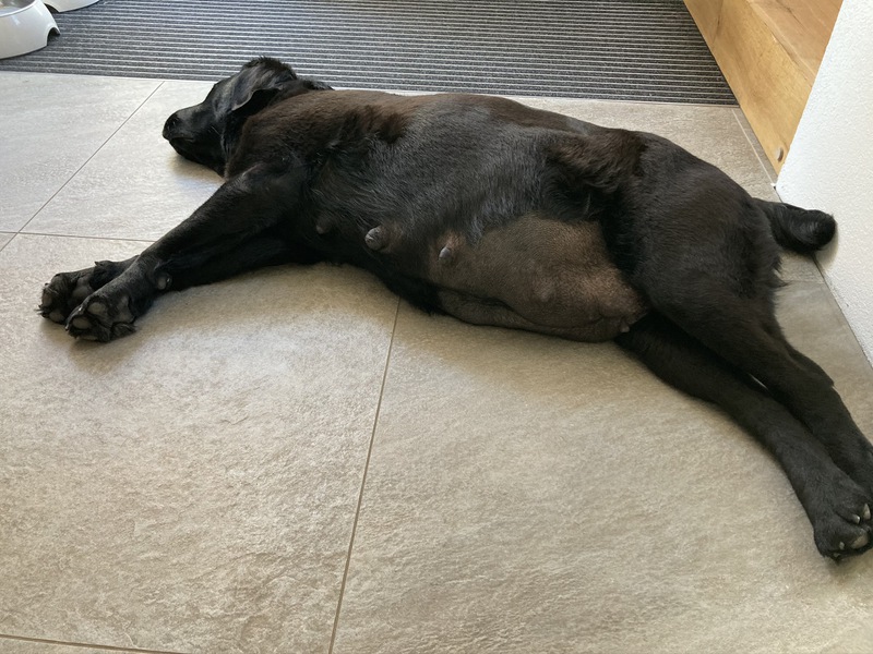 Am vergangenen Montag den 31.08.2020 (Tag 61 der Trächtigkeit) brachte Emma 6 schwarze Hündinnen und 4 schwarze Rüden auf die Welt. Der erste Welpe ließ lange auf sich warten. Trotz anhaltenden Presswehen über mehrere Stunden hatte Emma große Mühe den Welpen auf die Welt zu bringen. Erstaunlicherweise lebte dieser und war topfit. Auch mit dem zweiten Welpen - ein Rüde - hatte Emma zu kämpfen, er steckte lange im Geburtskanal fest. Leider hat er es nicht geschafft. Er brachte stolze 560 g auf die Waage... So entschieden wir uns nach dem 3. Welpen - Emma zuliebe und um die restlichen Welpen nicht zu gefährden - schweren Herzens zu einem Kaiserschnitt. Insbesondere da sich noch weitere 7 Welpen den Weg ins Leben erkämpfen mussten. Eine gute Entscheidung wie sich heraus stellte, denn auch die restlichen Welpen brachten recht hohe Gewichte auf die Waage. Am Ende verbleiben 9 quiekende und fidele Welpen in der Wurfkiste :-)