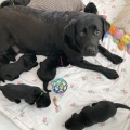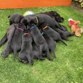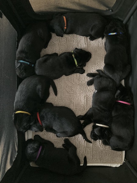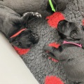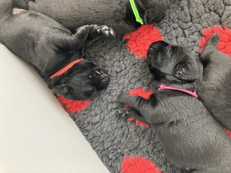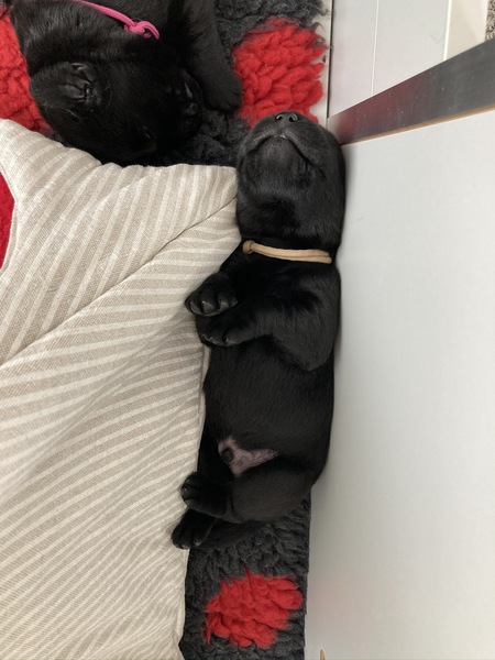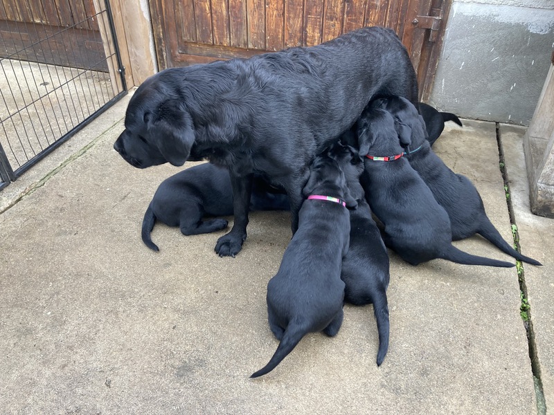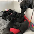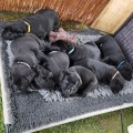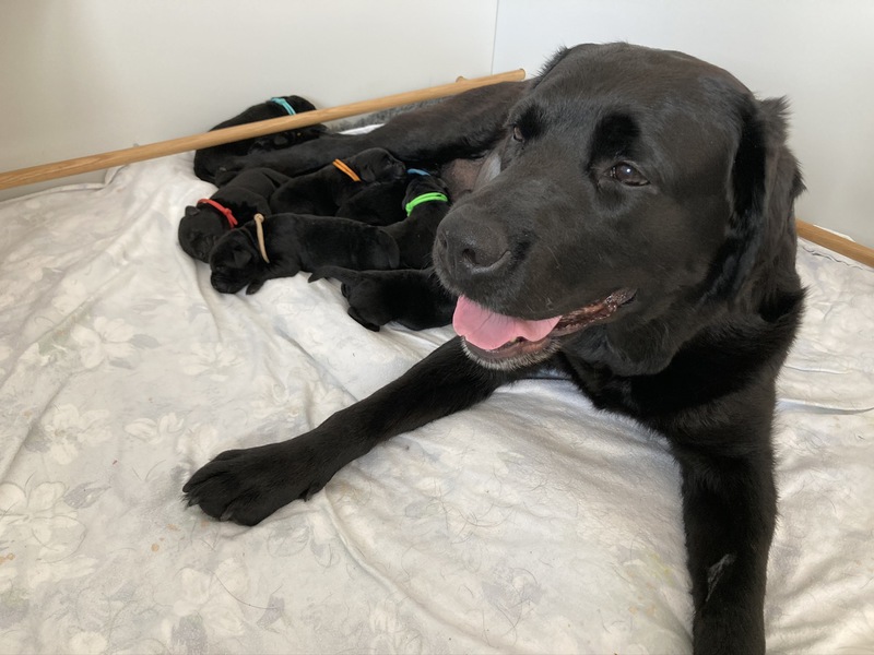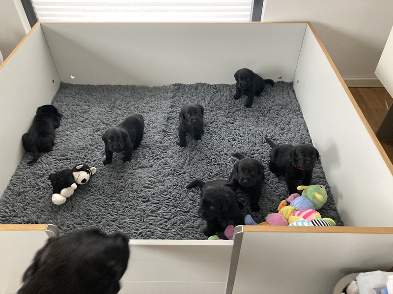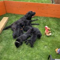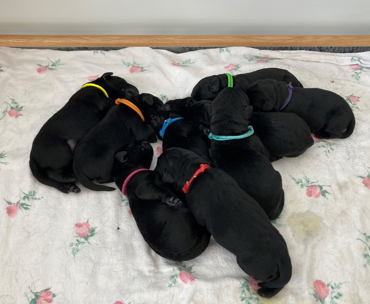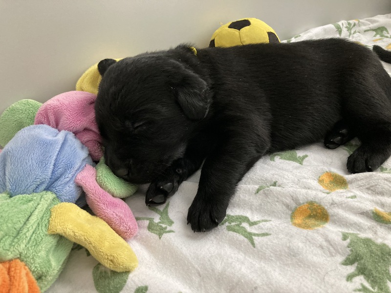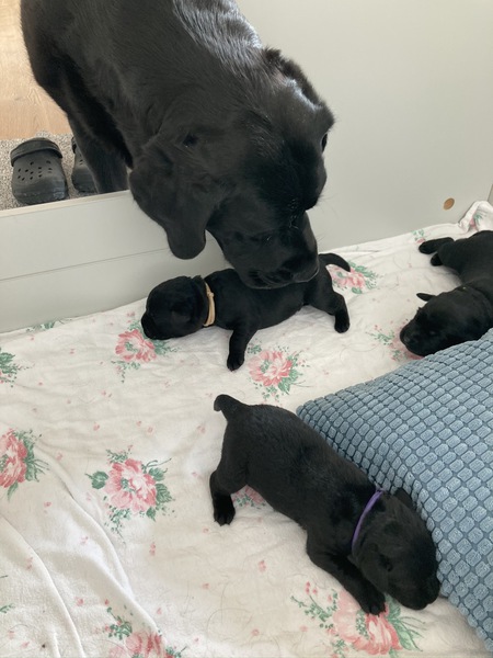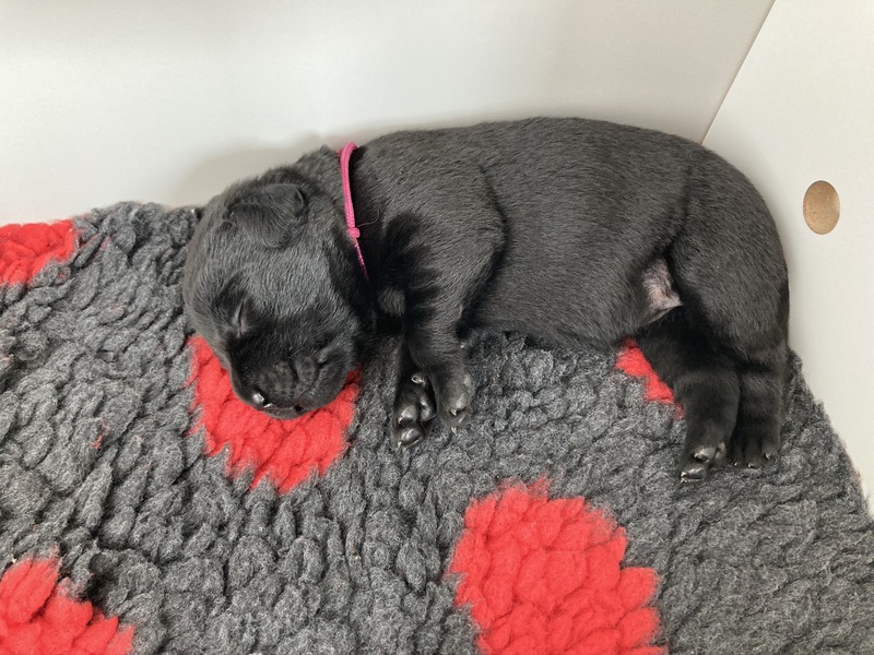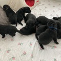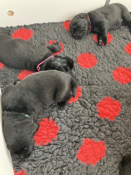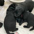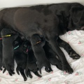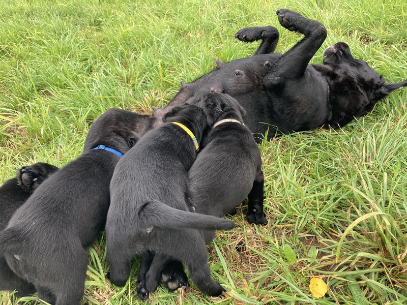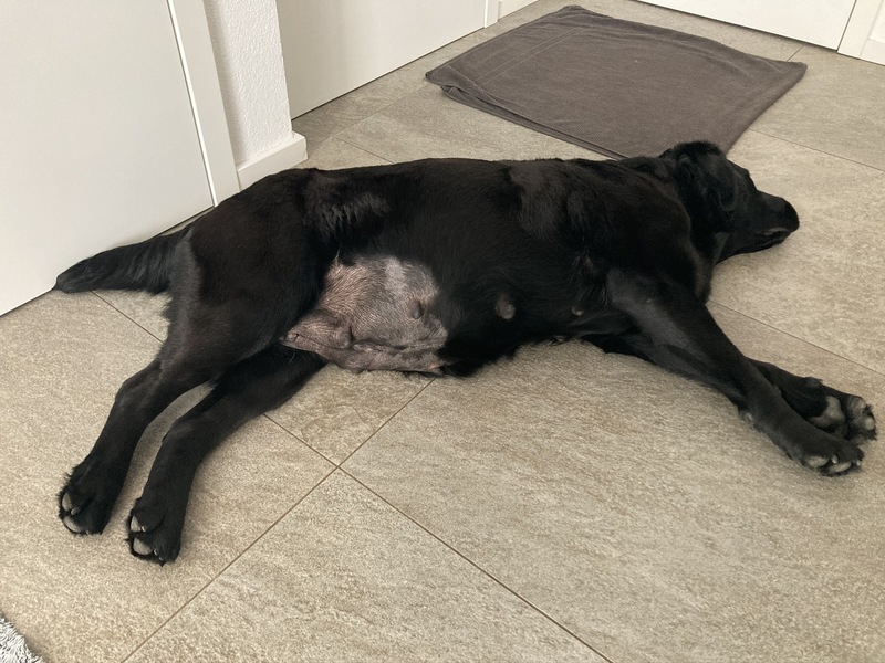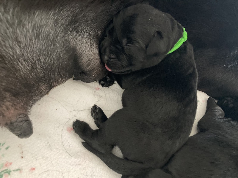 Am vergangenen Montag den 31.08.2020 (Tag 61 der Trächtigkeit) brachte Emma 6 schwarze Hündinnen und 4 schwarze Rüden auf die Welt. Der erste Welpe ließ lange auf sich warten. Trotz anhaltenden Presswehen über mehrere Stunden hatte Emma große Mühe den Welpen auf die Welt zu bringen. Erstaunlicherweise lebte dieser und war topfit. Auch mit dem zweiten Welpen - ein Rüde - hatte Emma zu kämpfen, er steckte lange im Geburtskanal fest. Leider hat er es nicht geschafft. Er brachte stolze 560 g auf die Waage... So entschieden wir uns nach dem 3. Welpen - Emma zuliebe und um die restlichen Welpen nicht zu gefährden - schweren Herzens zu einem Kaiserschnitt. Insbesondere da sich noch weitere 7 Welpen den Weg ins Leben erkämpfen mussten. Eine gute Entscheidung wie sich heraus stellte, denn auch die restlichen Welpen brachten recht hohe Gewichte auf die Waage. Am Ende verbleiben 9 quiekende und fidele Welpen in der Wurfkiste :-)