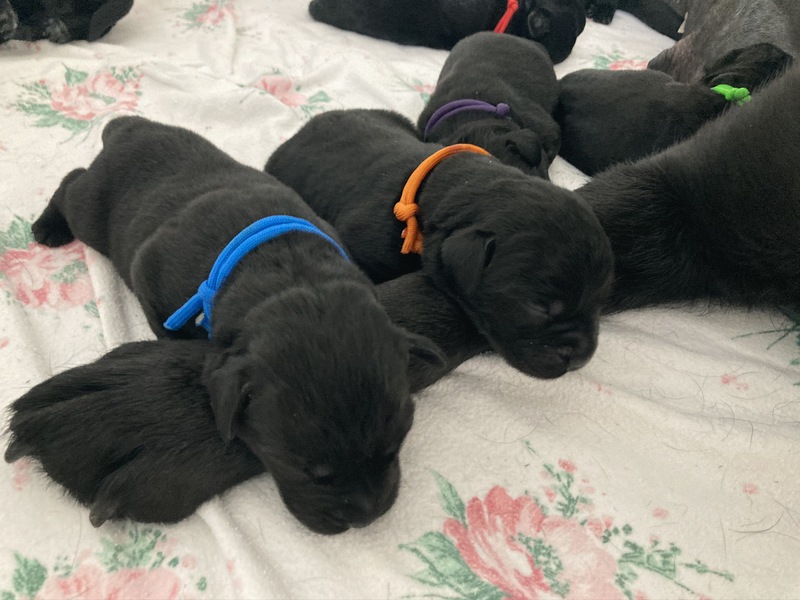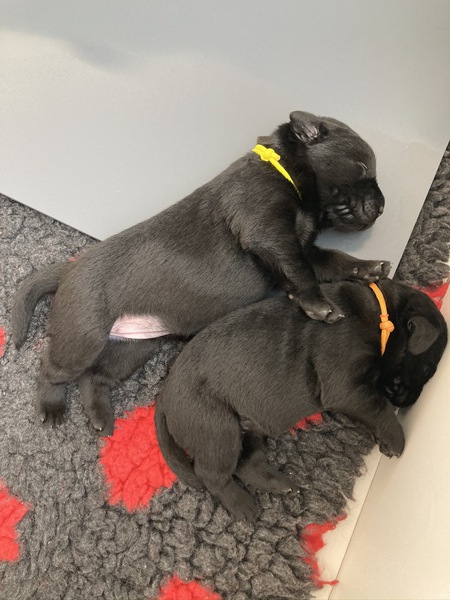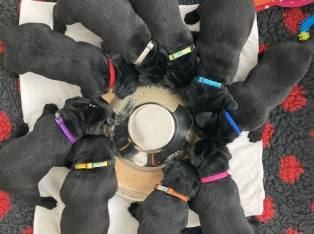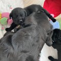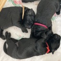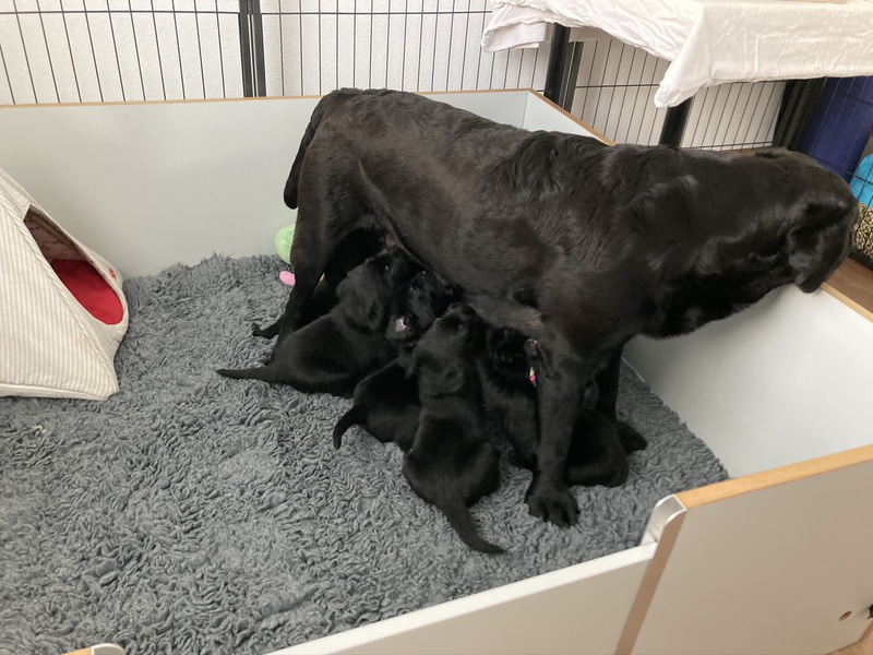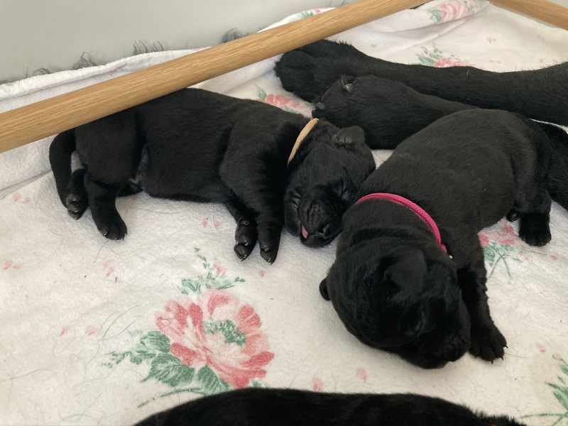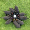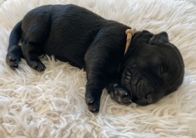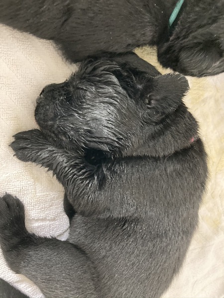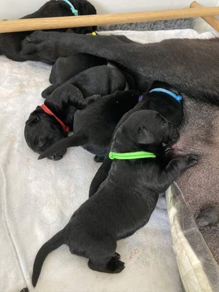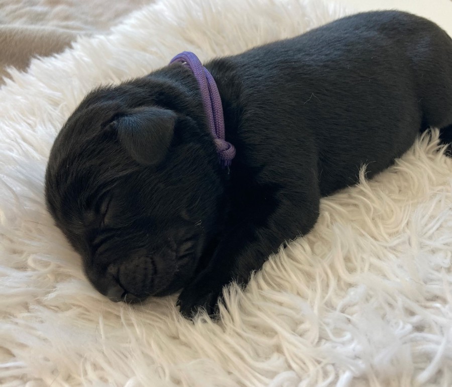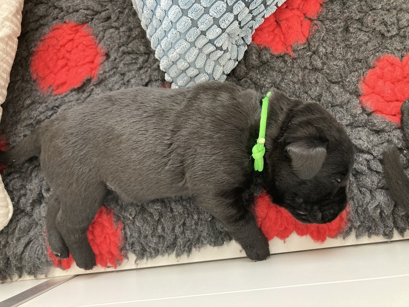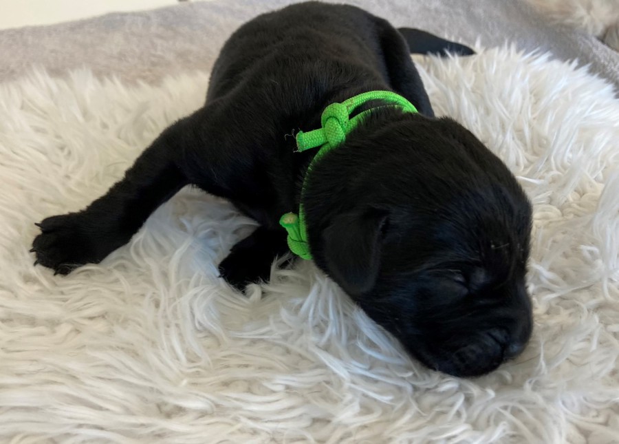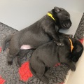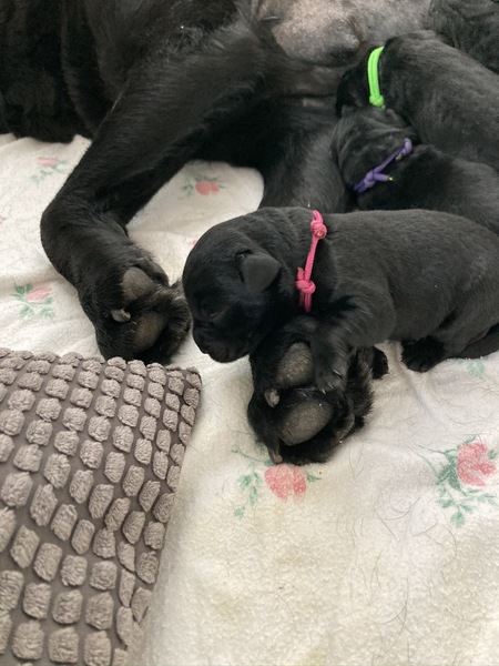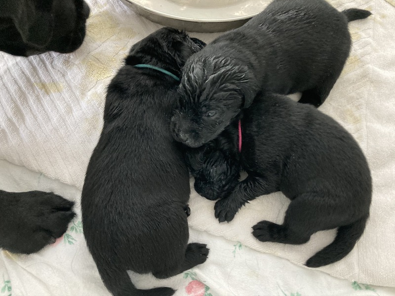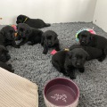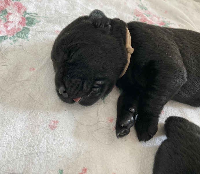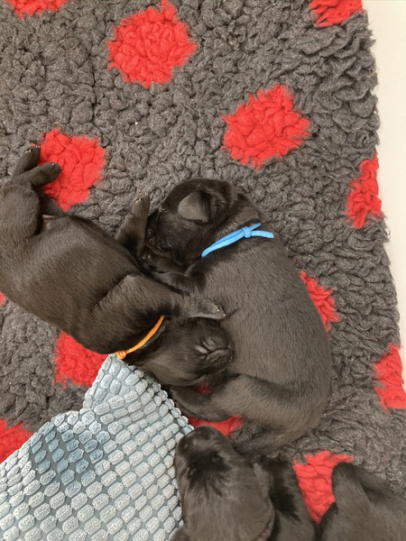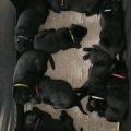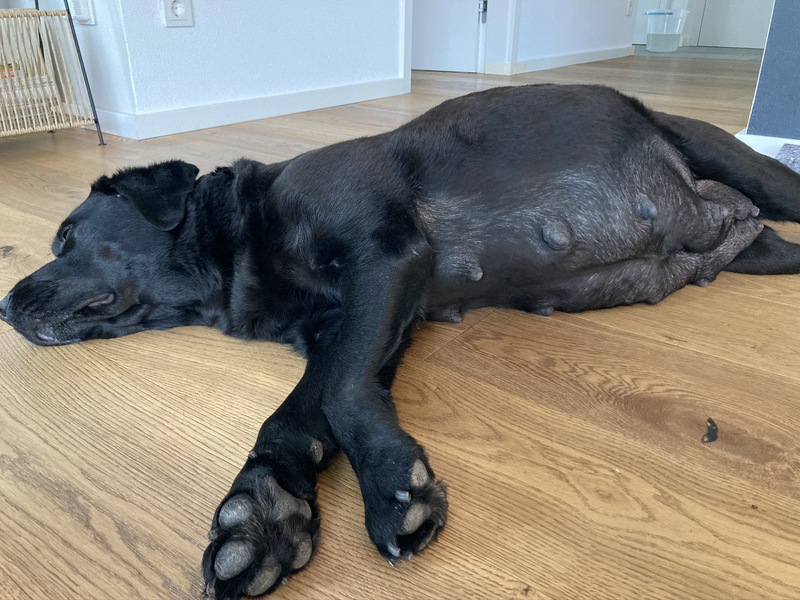 Am vergangenen Montag den 31.08.2020 (Tag 61 der Trächtigkeit) brachte Emma 6 schwarze Hündinnen und 4 schwarze Rüden auf die Welt. Der erste Welpe ließ lange auf sich warten. Trotz anhaltenden Presswehen über mehrere Stunden hatte Emma große Mühe den Welpen auf die Welt zu bringen. Erstaunlicherweise lebte dieser und war topfit. Auch mit dem zweiten Welpen - ein Rüde - hatte Emma zu kämpfen, er steckte lange im Geburtskanal fest. Leider hat er es nicht geschafft. Er brachte stolze 560 g auf die Waage... So entschieden wir uns nach dem 3. Welpen - Emma zuliebe und um die restlichen Welpen nicht zu gefährden - schweren Herzens zu einem Kaiserschnitt. Insbesondere da sich noch weitere 7 Welpen den Weg ins Leben erkämpfen mussten. Eine gute Entscheidung wie sich heraus stellte, denn auch die restlichen Welpen brachten recht hohe Gewichte auf die Waage. Am Ende verbleiben 9 quiekende und fidele Welpen in der Wurfkiste :-)