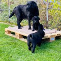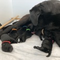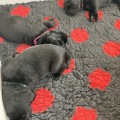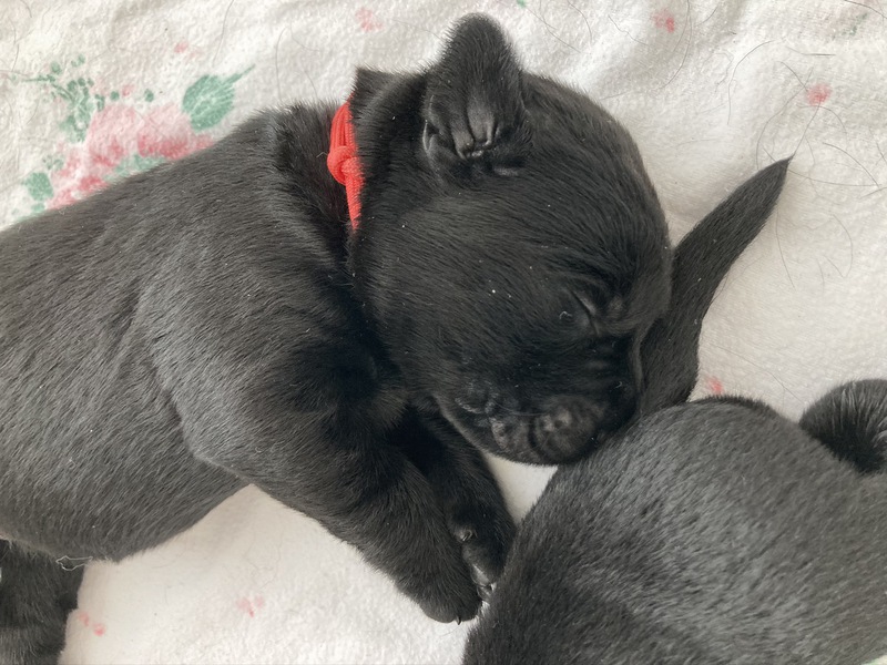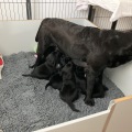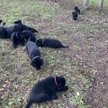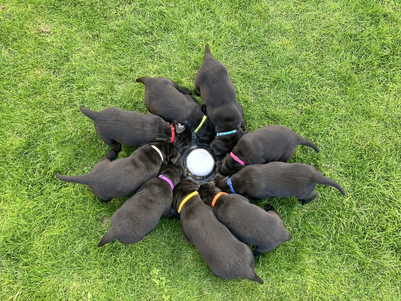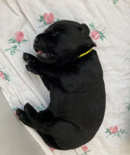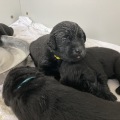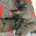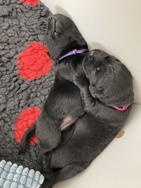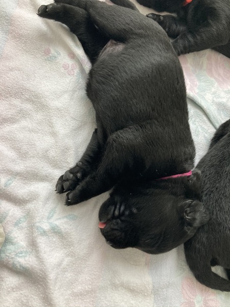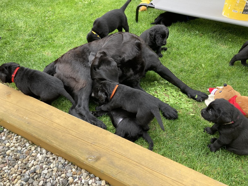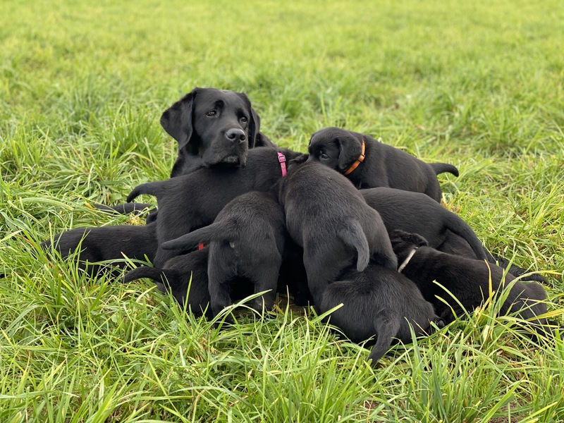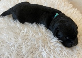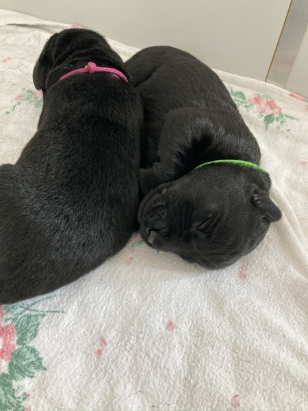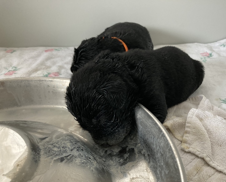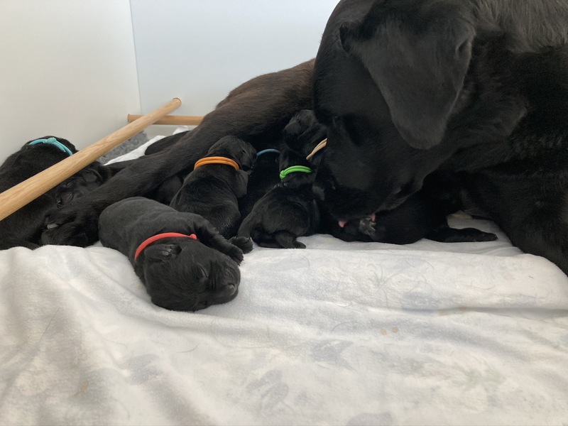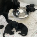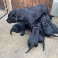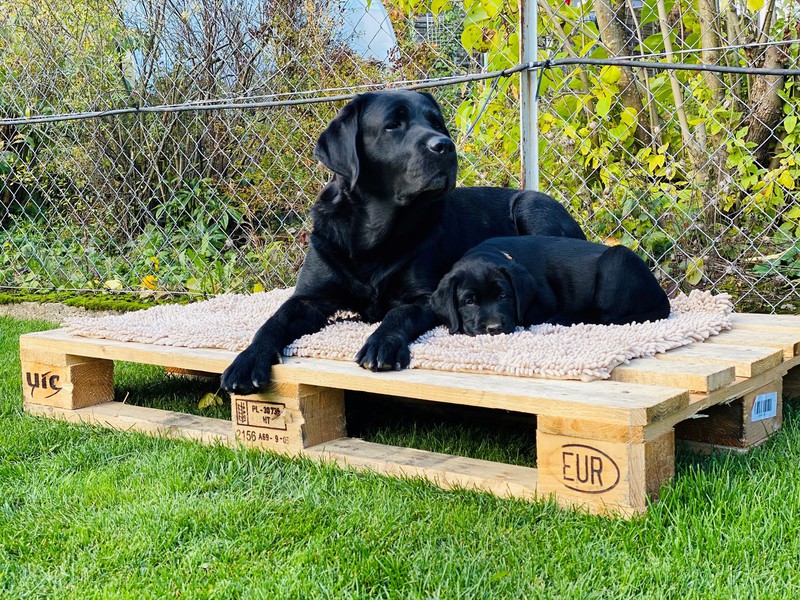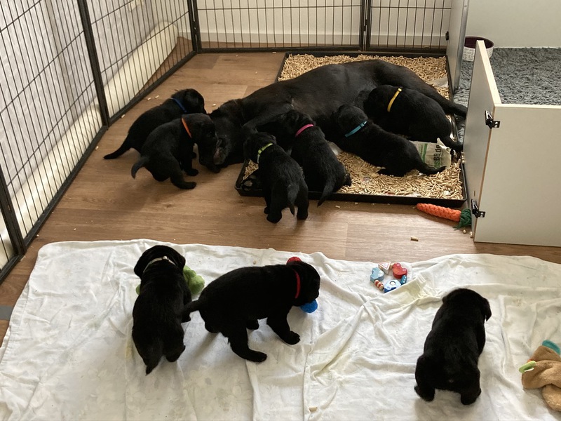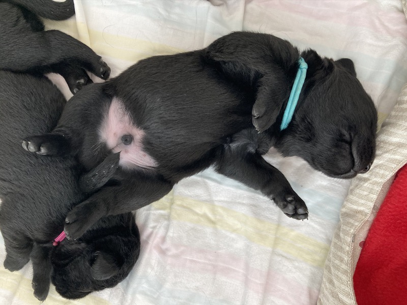 Am vergangenen Montag den 31.08.2020 (Tag 61 der Trächtigkeit) brachte Emma 6 schwarze Hündinnen und 4 schwarze Rüden auf die Welt. Der erste Welpe ließ lange auf sich warten. Trotz anhaltenden Presswehen über mehrere Stunden hatte Emma große Mühe den Welpen auf die Welt zu bringen. Erstaunlicherweise lebte dieser und war topfit. Auch mit dem zweiten Welpen - ein Rüde - hatte Emma zu kämpfen, er steckte lange im Geburtskanal fest. Leider hat er es nicht geschafft. Er brachte stolze 560 g auf die Waage... So entschieden wir uns nach dem 3. Welpen - Emma zuliebe und um die restlichen Welpen nicht zu gefährden - schweren Herzens zu einem Kaiserschnitt. Insbesondere da sich noch weitere 7 Welpen den Weg ins Leben erkämpfen mussten. Eine gute Entscheidung wie sich heraus stellte, denn auch die restlichen Welpen brachten recht hohe Gewichte auf die Waage. Am Ende verbleiben 9 quiekende und fidele Welpen in der Wurfkiste :-)