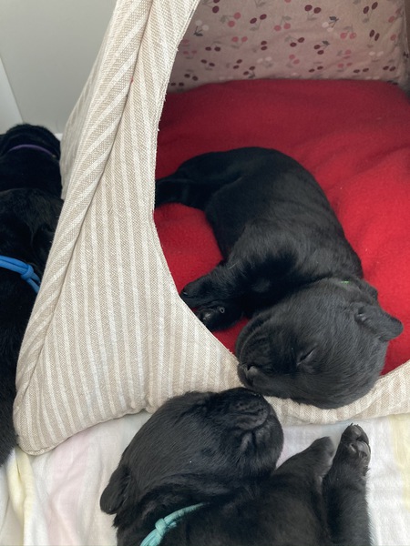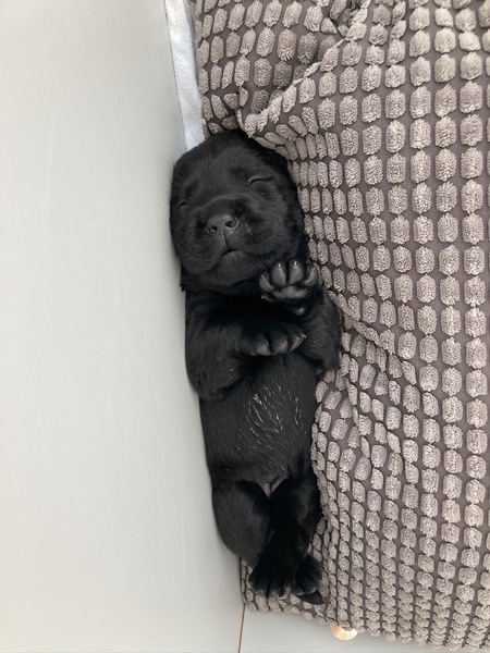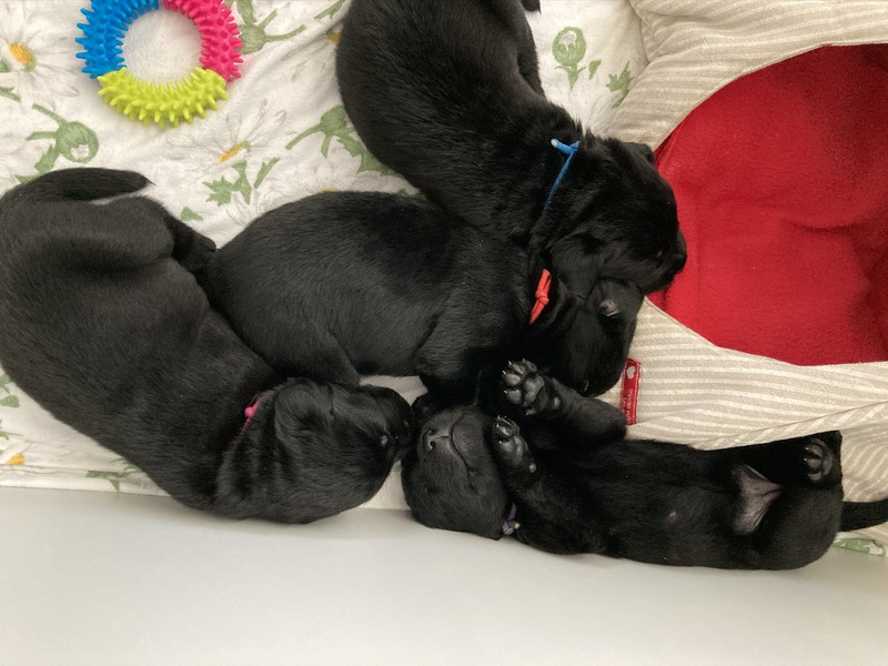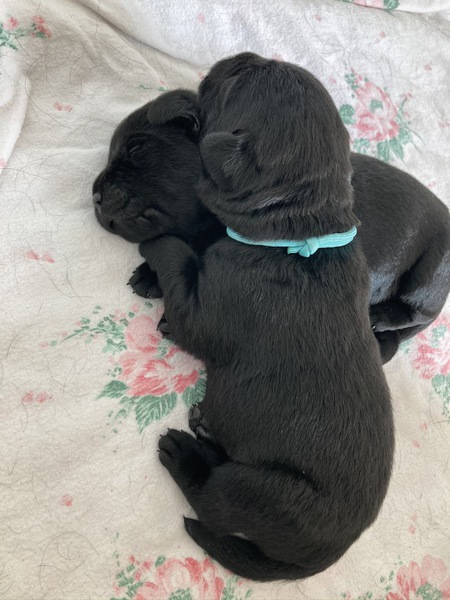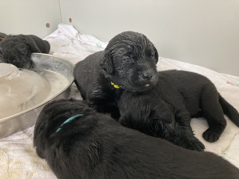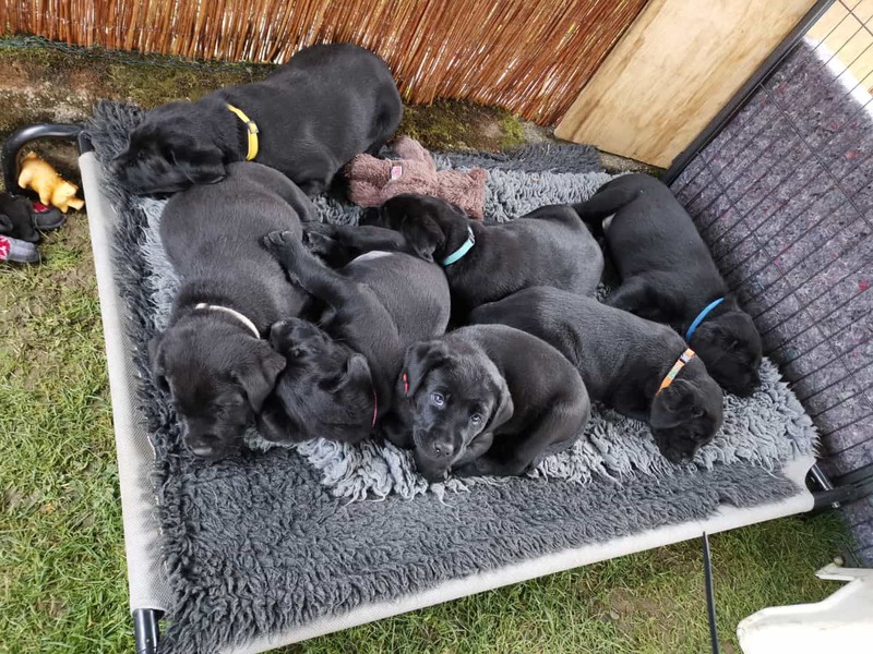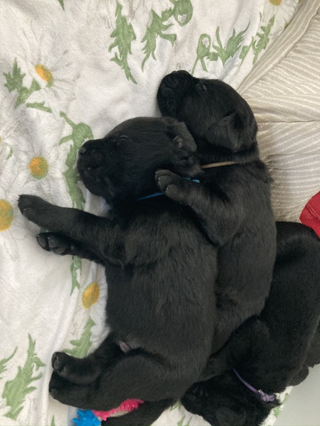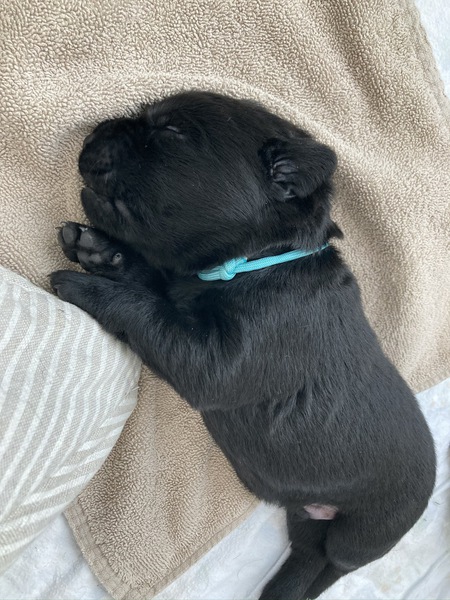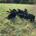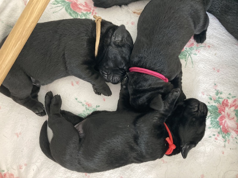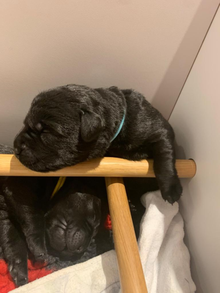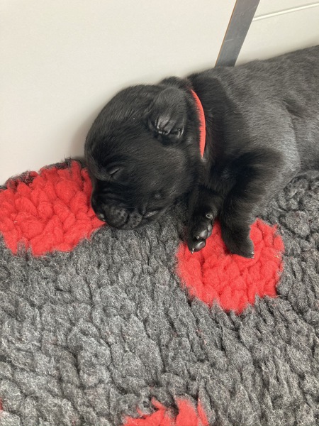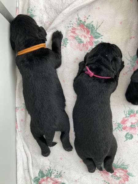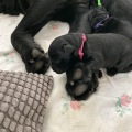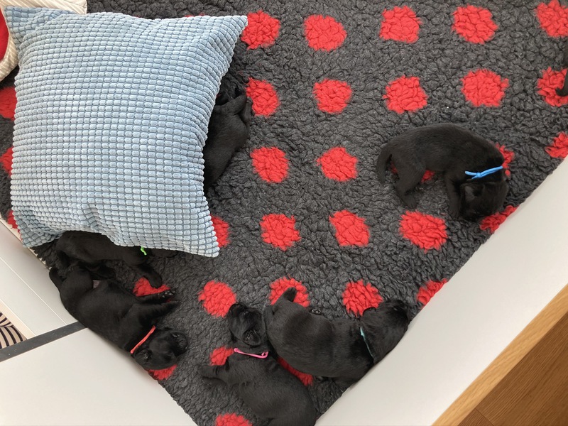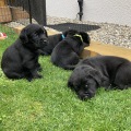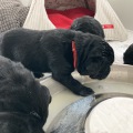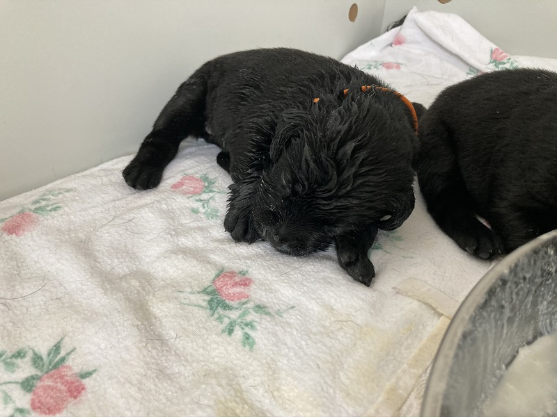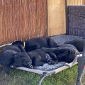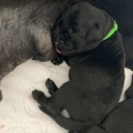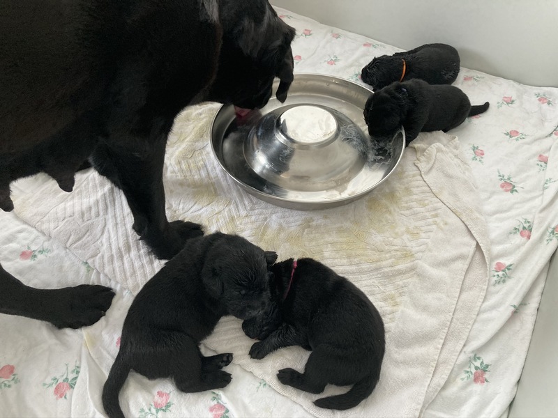 Am vergangenen Montag den 31.08.2020 (Tag 61 der Trächtigkeit) brachte Emma 6 schwarze Hündinnen und 4 schwarze Rüden auf die Welt. Der erste Welpe ließ lange auf sich warten. Trotz anhaltenden Presswehen über mehrere Stunden hatte Emma große Mühe den Welpen auf die Welt zu bringen. Erstaunlicherweise lebte dieser und war topfit. Auch mit dem zweiten Welpen - ein Rüde - hatte Emma zu kämpfen, er steckte lange im Geburtskanal fest. Leider hat er es nicht geschafft. Er brachte stolze 560 g auf die Waage... So entschieden wir uns nach dem 3. Welpen - Emma zuliebe und um die restlichen Welpen nicht zu gefährden - schweren Herzens zu einem Kaiserschnitt. Insbesondere da sich noch weitere 7 Welpen den Weg ins Leben erkämpfen mussten. Eine gute Entscheidung wie sich heraus stellte, denn auch die restlichen Welpen brachten recht hohe Gewichte auf die Waage. Am Ende verbleiben 9 quiekende und fidele Welpen in der Wurfkiste :-)