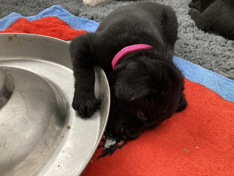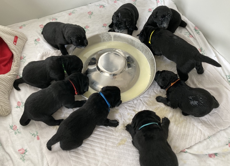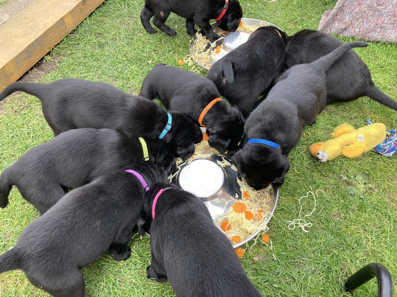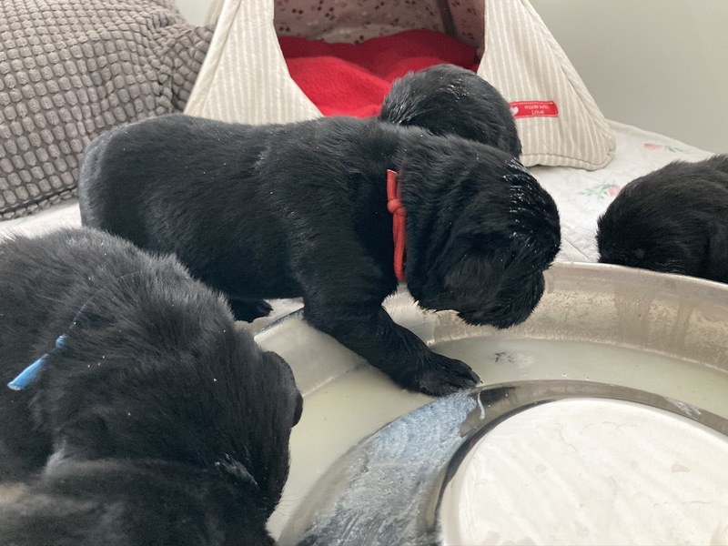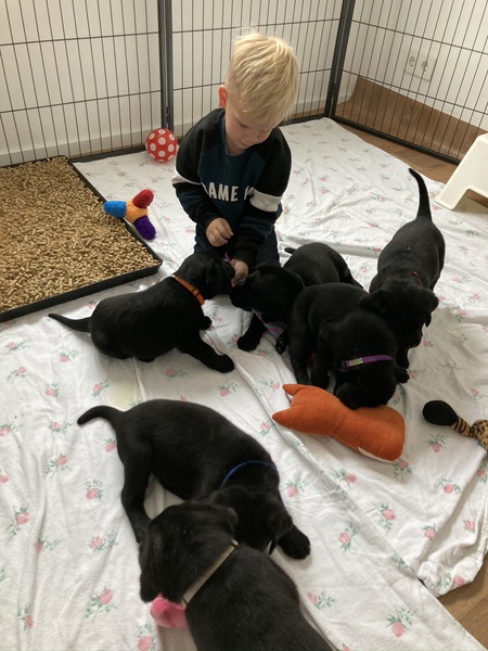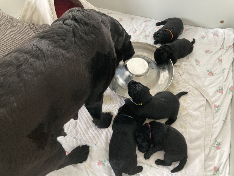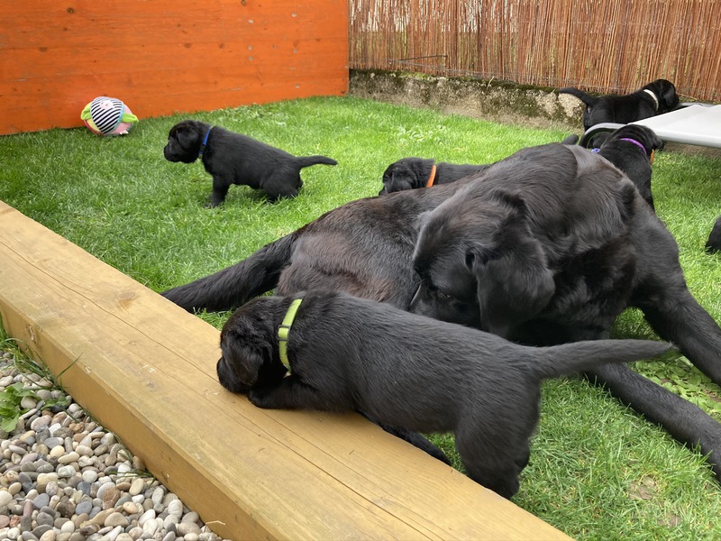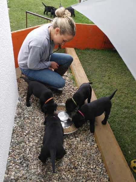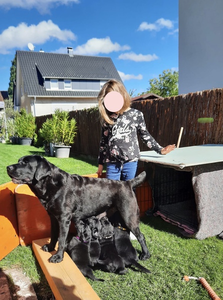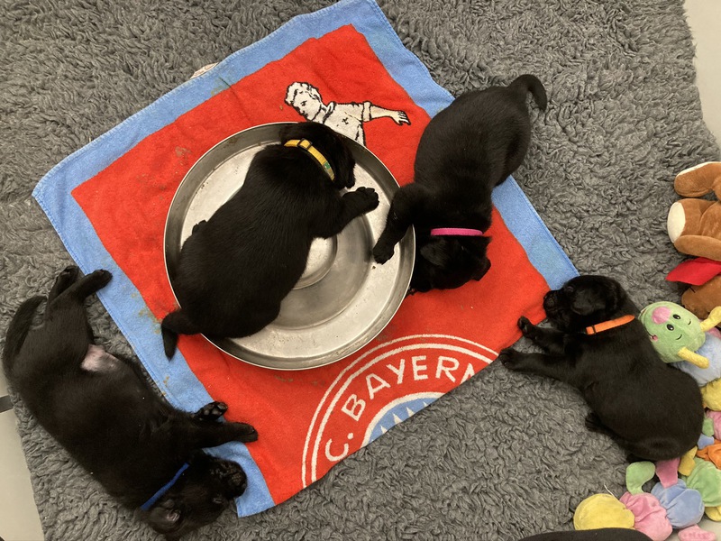 Was ist noch so passiert in den vergangenen Wochen? Ausser Wachsen und Gedeihen, wurde mal wieder entwurmt. Und es war wieder viel Besuch da. Von Klein bis Groß durften alle mit den Welpen spielen und kuscheln. Apropos Wachsen und Gedeihen: Es wird viel gefuttert, sehr sehr viel! Irgendwie bin ich den halben Tag nur mit Füttern beschäftigt (den restlichen halben Tag übrigens mit Kot aufsammeln, Welpenzimmer säubern, Krallen kürzen und Wäsche waschen - die Waschmaschine läuft 24h am Tag). Als Vor- und Nachspeise wird noch 4-5x täglich bei der Mama Milch gezapft. Als Hauptgang gibt es 3x täglich eingeweichtes Trockenfutter, sowie 1x täglich eine kleine Zwischenmahlzeit on top: Hier wird alles verfüttert was das Welpenherz begehrt und der Welpenmagen verträgt: Quark mit zerquetschten Bananen, Naturjoghurt mit Apfel und Birne, Thunfisch mit Hüttenkäse, Karotten-/Kartoffelbrei, Honigmelone, Nudeln mit Möhren, Hühnchen mit Reis, Hüttenkäse mit gekochten Eiern, Haferflockenbrei mit Obst, etc. Was soll ich sagen... Sie fressen und mögen einfach alles! Hmmmm... sind das etwa Labradore?!