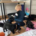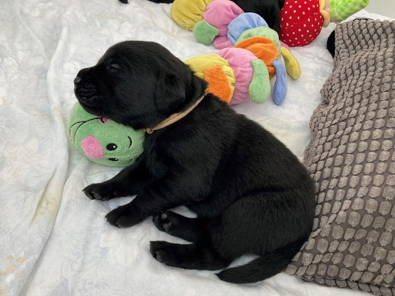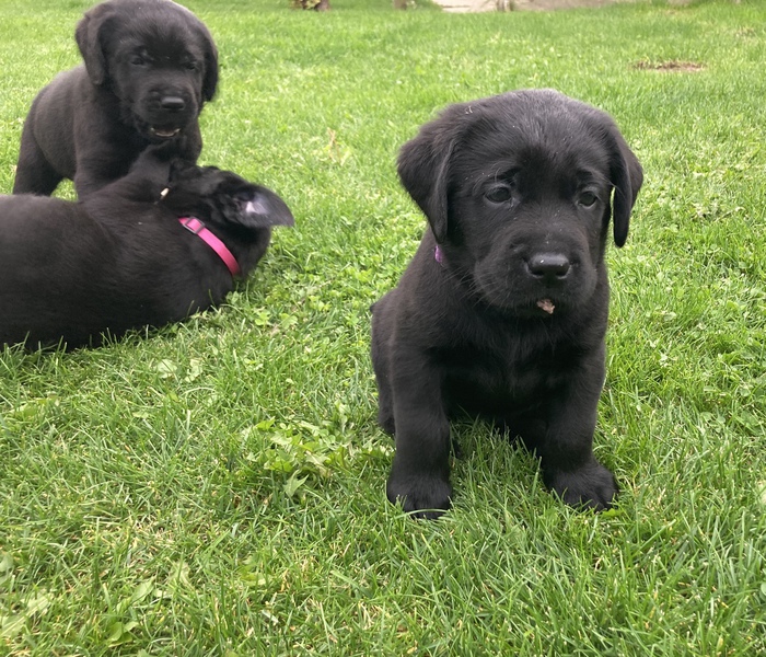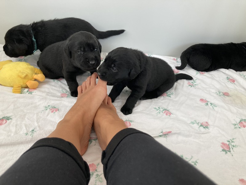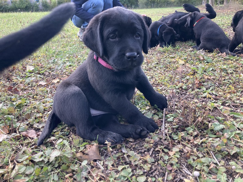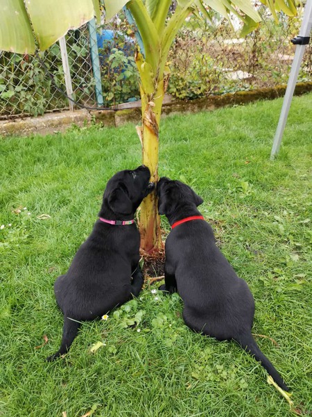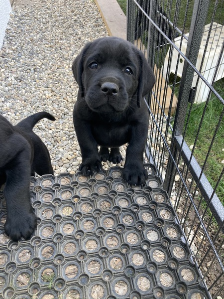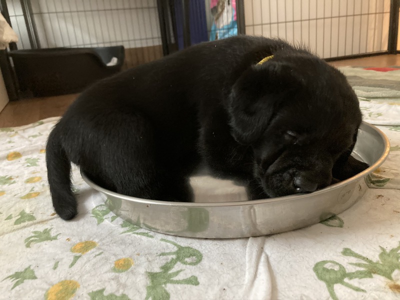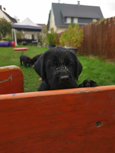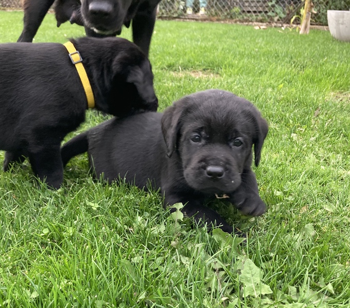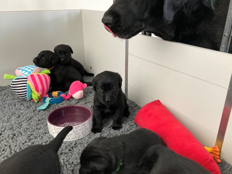 Was ist noch so passiert in den vergangenen Wochen? Ausser Wachsen und Gedeihen, wurde mal wieder entwurmt. Und es war wieder viel Besuch da. Von Klein bis Groß durften alle mit den Welpen spielen und kuscheln. Apropos Wachsen und Gedeihen: Es wird viel gefuttert, sehr sehr viel! Irgendwie bin ich den halben Tag nur mit Füttern beschäftigt (den restlichen halben Tag übrigens mit Kot aufsammeln, Welpenzimmer säubern, Krallen kürzen und Wäsche waschen - die Waschmaschine läuft 24h am Tag). Als Vor- und Nachspeise wird noch 4-5x täglich bei der Mama Milch gezapft. Als Hauptgang gibt es 3x täglich eingeweichtes Trockenfutter, sowie 1x täglich eine kleine Zwischenmahlzeit on top: Hier wird alles verfüttert was das Welpenherz begehrt und der Welpenmagen verträgt: Quark mit zerquetschten Bananen, Naturjoghurt mit Apfel und Birne, Thunfisch mit Hüttenkäse, Karotten-/Kartoffelbrei, Honigmelone, Nudeln mit Möhren, Hühnchen mit Reis, Hüttenkäse mit gekochten Eiern, Haferflockenbrei mit Obst, etc. Was soll ich sagen... Sie fressen und mögen einfach alles! Hmmmm... sind das etwa Labradore?!