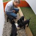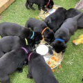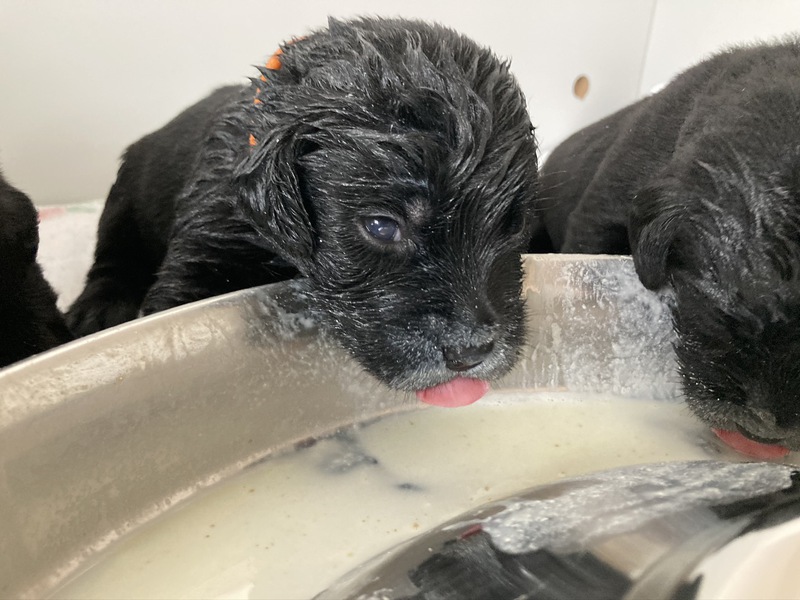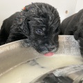 In der 3. Lebenswoche gab es zunächst 1x täglich und ab der 4. Lebenswoche 2x täglich einen leckeren Milchbrei, den alle bis auf den letzten Tropfen aufschleckten. Mama Emma guckt gelassen zu und wartet brav vor der Wurfkiste bis sie an der Reihe ist. Denn nach der Milchmahlzeit heißt es "einmal Großputz bitte". Welpe für Welpe wird fein säuberlich sauber gemacht, bis auch der letzte Rest Milch aus dem Fell geschleckt ist.