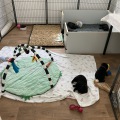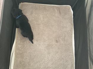 Tägliches Kennel-Training steht jetzt auch auf dem Programm. Immer wenn die Wurfkiste gereinigt wird, ziehen die Welpen für kurze Zeit in eine Hundebox um und gucken sich die Lage mal aus einer anderen Perspektive an. Zunächst alle gemeinsam, später dann auch mal alleine. Und es klappt schon ganz gut. Meist wird erst jede Ecke inspiziert, dann gepiselt und dann wird auch schon wieder geschlafen!