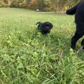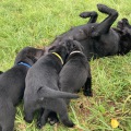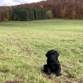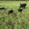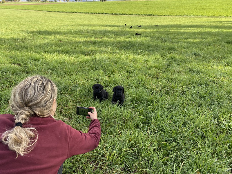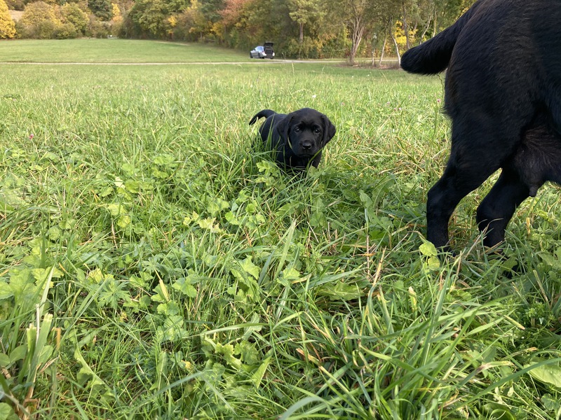 Immer selbstbewusster - mit viel Entdeckungs- und Bewegungsdrang - erobern die 6 Wochen alten kleinen Monster ihr Umfeld. Der erste Ausflug stand am Wochenende an. Den Kennel kennen sie ja schon vom morgendlichen Großputz, so war die erste Autofahrt im Kennel auch kein Problem. Auf der Wiese angekommen, wurde erst einmal jeder Grashalm inspiziert. Als sich Mama Emma dann weiter entfernte, wurde die Verfolgungsjagd aufgenommen. Mit Vollgas der Mama hinterher und ja nie aus den Augen verlieren, sonst ist sie wieder weg. Mutterseelenallein sitzt dann der ein oder andere auf der Wiese und schaut blöd aus der Wäsche, weil schnüffeln für einen kurzen Moment interessanter war. Nun, da sie ja jetzt Brennesseln und Disteln kennen, würde ich sie direkt als "Geländehart" einstufen - denn alle verhielten sich recht entspannt ;-). Und wenn Jogger und Fahrradfahrer am Feldweg vorbei kommen und die Mama jede Bewegung in der näheren Umgebung zum Schutz der Welpenscharr genauestens beobachtet, motzt Mr. Blau fleissig im Chor mit Mama mit. Was bleiben die Leute auch stehen und gucken?! Geht ja gar nicht!!