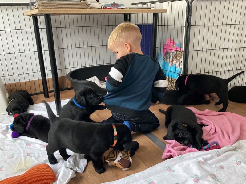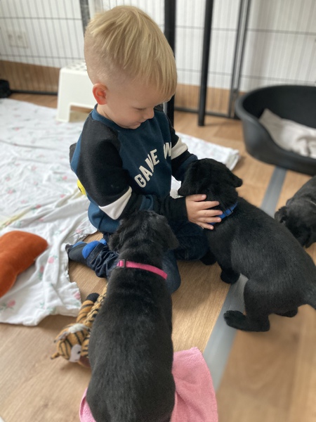 Auch der langersehnte Besuch durfte jetzt endlich vorbei kommen. Die zukünftigen Welpenbesitzer konnten es gar nicht mehr abwarten die Welpen mit knapp 3 Wochen zum ersten Mal kennenzulernen, sich in die Wurfkiste zu setzen und ausgiebig mit den Welpen zu kuscheln. Interessiert und neugierig haben die Zwerge jeden Menschen erkundet.