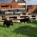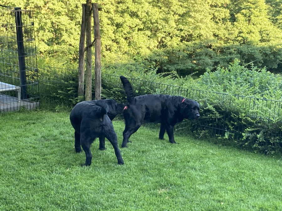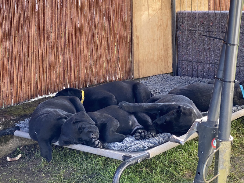 Der gesamte Garten steht den Welpen jetzt zur Verfügung und sie rennen, toben und spielen bereits in jeder Ecke. Bei den Temperaturen muss man sich schließlich viel bewegen, damit einem nicht kalt wird. Werden sie müde, begeben sich die kleinen Monster selbständig zurück in den kleinen Gartenauslauf auf das Hundehängebett. Dicht aneinander gekuschelt auf einem gemütlichen Fell wird dann schnell geschlummert und von der nächsten Mahlzeit geträumt.